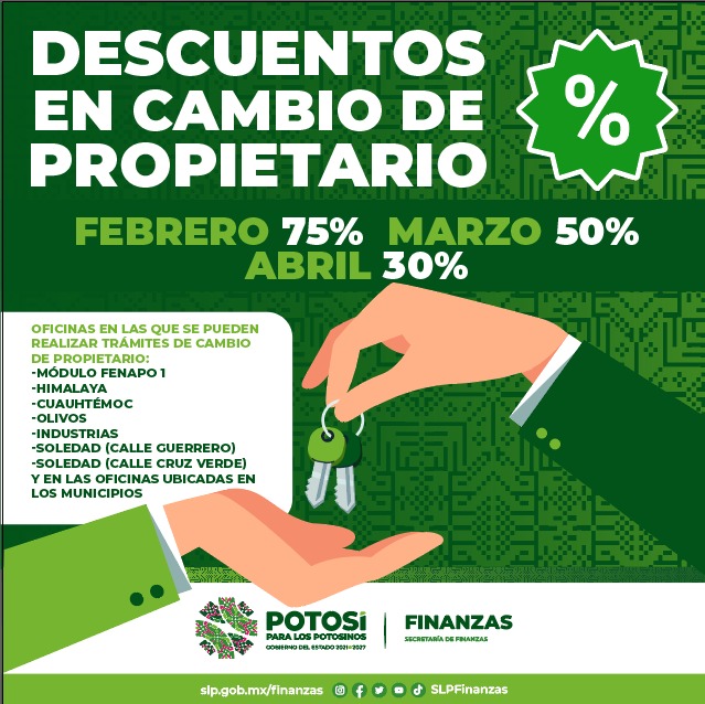 El 28 de febrero es el último día para acceder al 75 por ciento de descuento en el trámite de cambio de propietario de vehículos, en oficinas recaudadoras de la zona metropolitana y los municipios, dio a conocer Salvador González Martínez, secretario de Finanzas, quien destacó que en marzo, el descuento será del 50 por ciento y 30 por ciento en abril.