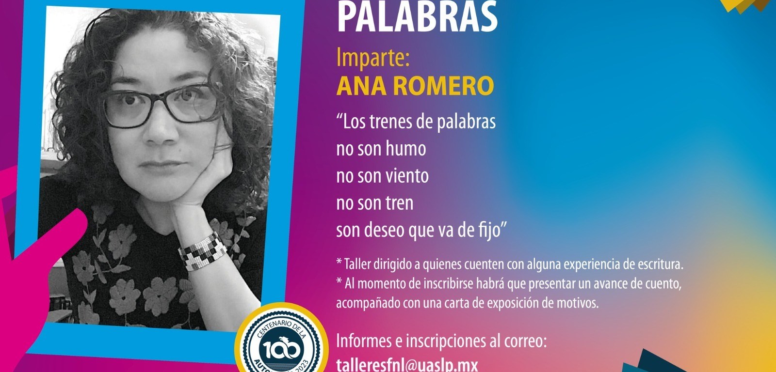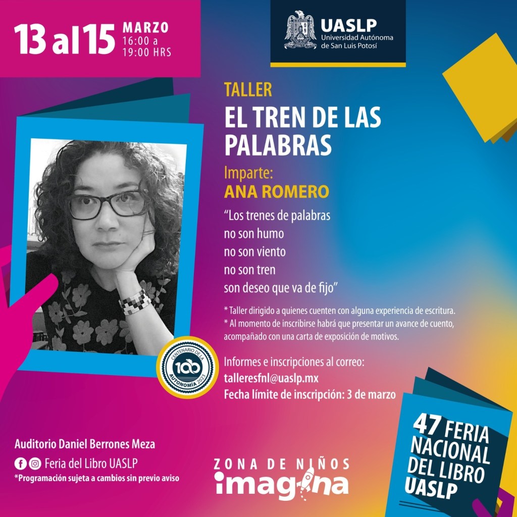 La Facultad de Ciencias Sociales y Humanidades (FCSyH) en el marco de la 47 Feria Nacional del Libro de la UASLP, convoca al público en general a inscribirse al taller de cuento que impartirá de manera presencial la escritora Ana Romero, los días 13, 14 y 15 de marzo en el Auditorio “Daniel Berrones Meza”, en un horario de 16:00 a 19:00 horas.