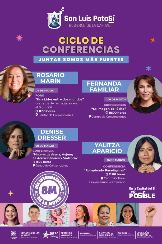 El ciclo de conferencias inicia este sábado 4 de marzo en el Centro de Convenciones de San Luis Potosí a las 11:30 horas, con la conferencia “Una líder entre dos mundos” de Rosario Marín, extesorera de los Estados Unidos en la administración de George W. Bush y la latina de más alto rango en la presidencia de aquel país, premiada por la ONU por sus trabajos en pro de las personas con discapacidad y también condecorada por el Senado Mexicano con la medalla Elvia Carrillo Puerto, por su lucha por el empoderamiento de las mujeres.