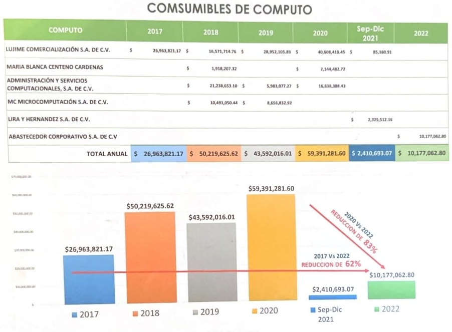 Tan solo en consumibles de cómputo, Carreras gastó 192 millones 754 mil 498 pesos, de los años 2017 al 2020; el proveedor favorito resultó Lujime Comercialización SA de CV, al recibir la mayor cantidad, que asciende a 113 millones 96 mil 231 pesos, lo cual resulta a simple vista un exceso porque el principal producto habría sido “toners” o cartuchos para impresora y recargados, no originales, memorias USB u otros artículos de bajo precio.