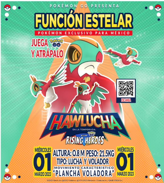 Además, esta nueva temporada tiene una sorpresa muy especial para los Entrenadores mexicanos, ya que tendrán la oportunidad de capturar a Hawlucha, que aparecerá en estado salvaje solamente en México. El diseño de este Pokémon está inspirado en la lucha libre mexicana y en homenaje a este deporte tiene un movimiento característico llamado “Plancha Voladora”.