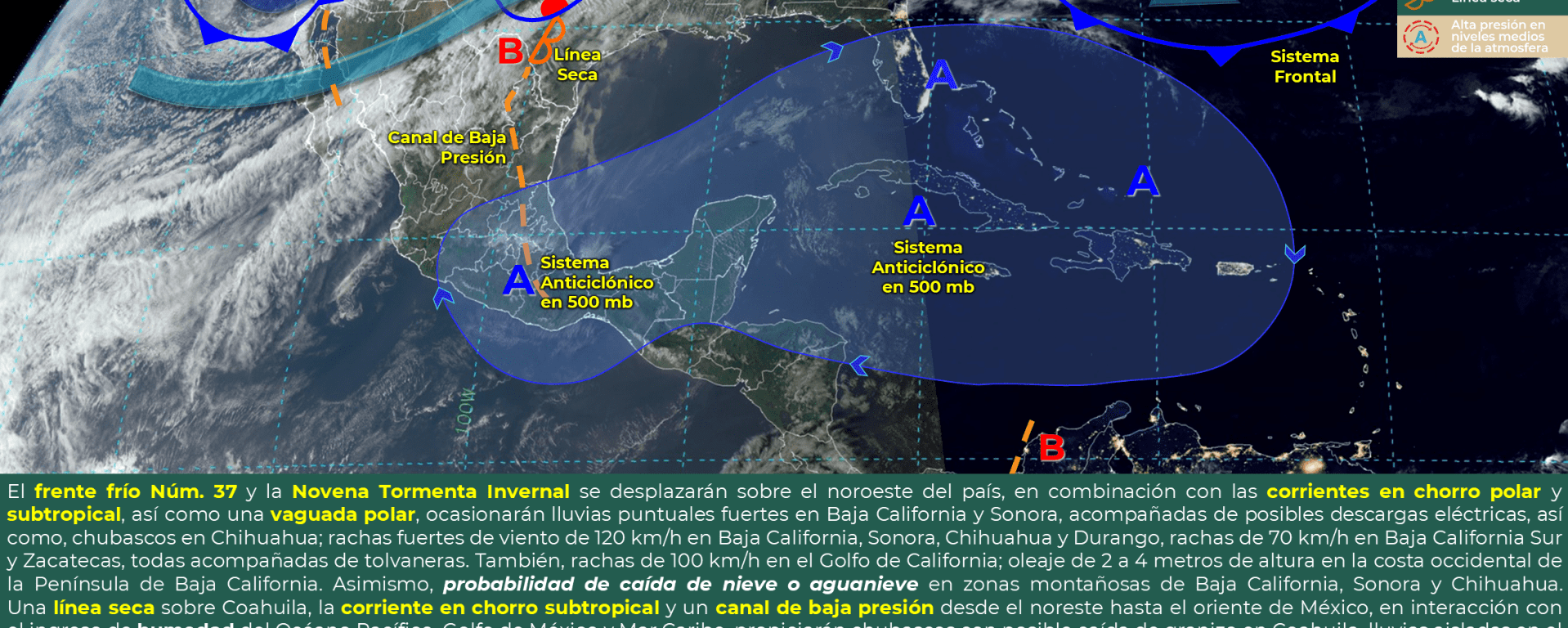 Se pronostican vientos con rachas de 100 a 120 km/h y tolvaneras en Baja California, Sonora, Chihuahua, Durango y norte del Golfo de California, además de rachas de 80 a 100 km/h y con tolvaneras en Coahuila.