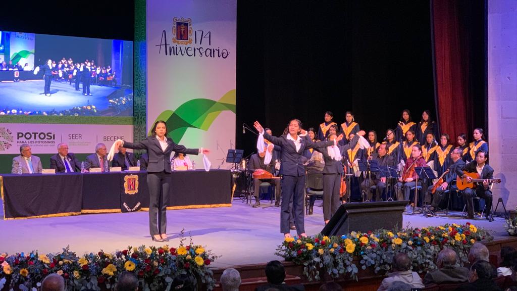 Este sábado 4 de marzo, la Benemérita y Centenaria Escuela Normal del Estado (Becene) celebró su 174 aniversario con una ceremonia solemne que se desarrolló en el Teatro de la Paz. Previamente, en los patios centrales de la institución fueron cantadas las tradicionales mañanitas por autoridades educativas, maestros, alumnos y exalumnos, informó el titular del Sistema Educativo Estatal Regular (SEER), Crisógono Sánchez Lara.