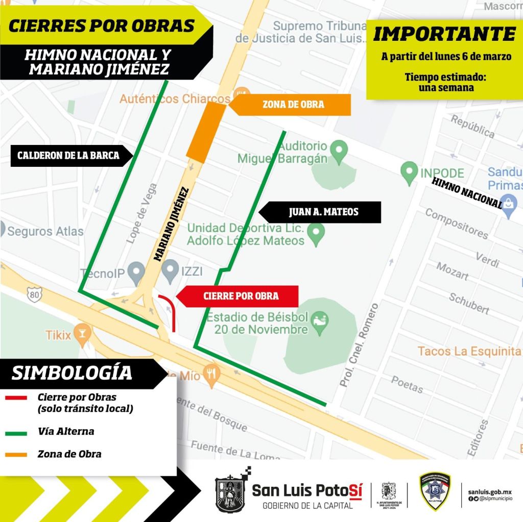 De acuerdo a lo informado por Seduvop, instancia que ejecuta la obra, se llevará a cabo cierre de circulación en el cruce de la avenida Himno Nacional y Mariano Jiménez, derivando en el cierre temporal de los carriles que corren de sur a norte desde Salvador Nava Martínez. Dicho cierre será a partir de este lunes 6 de marzo y se contempla que los trabajos tengan una duración de una semana.