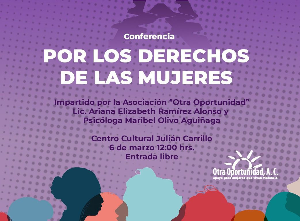 Explicó que esta conferencia se realiza también con el objetivo de disminuir las prácticas de discriminación hacia las mujeres, así como facilitar y acercar información en temas de derechos humanos, ruta crítica de atención para mujeres víctimas de violencia, así como brindar asesoría, orientación y atención en todos los servicios que Otra Oportunidad A.C. ofrece de manera gratuita y especializada.
