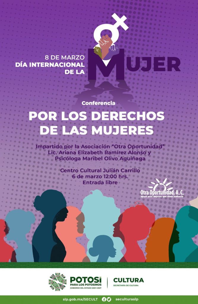 En el marco del Día Internacional de la Mujer, la Secretaría de Cultura (Secult), en colaboración con la asociación Otra Oportunidad, llevará a cabo la conferencia de prevención de la violencia de género, “Por los Derechos de las Mujeres”, acciones con las que se da seguimiento a la encomienda del Gobierno del cambio que encabeza Ricardo Gallardo Cardona de garantizar a las potosinas espacios seguros.