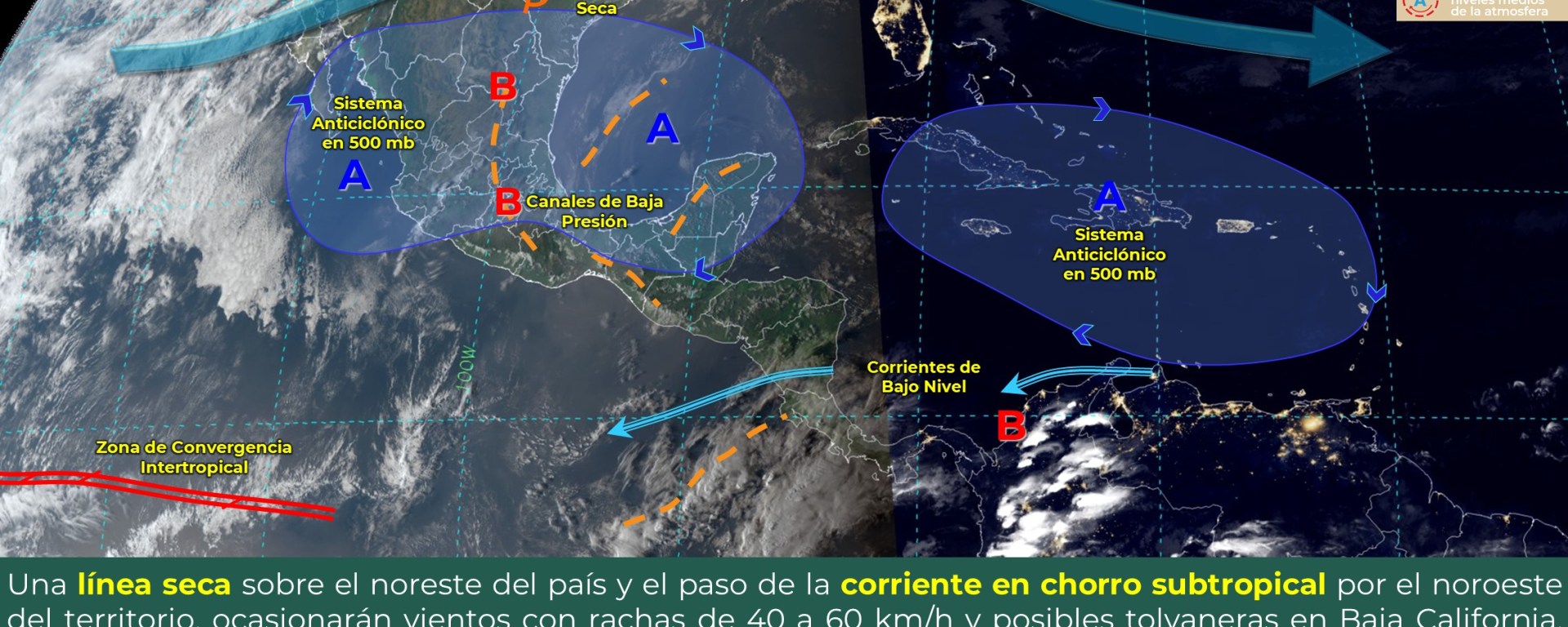 Viento con rachas de 50 a 70 km/h y posibles tolvaneras: Chihuahua, Coahuila, Nuevo León y Tamaulipas, así como en la costa oeste de Baja California y Baja California Sur.