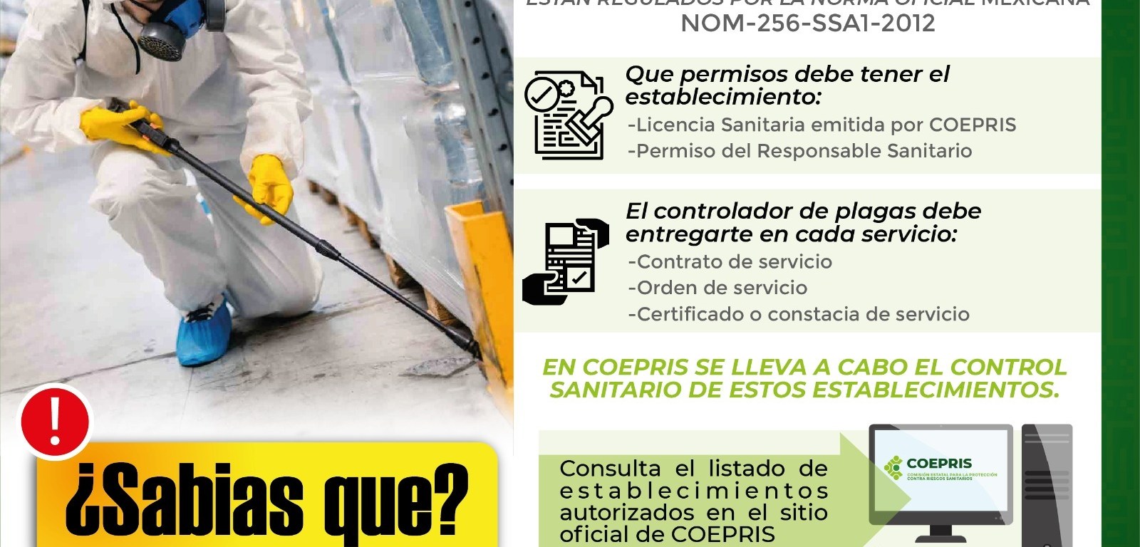 La COEPRIS recomienda a la población que tenga planeado contratar algún servicio de fumigación para su hogar o empresa, verifique que el establecimiento cuente con Licencia Sanitaria, solicitar por escrito las medidas de seguridad a seguir antes, durante y después de la aplicación del producto, exigir la constancia y el certificado del servicio el cual entre otros datos debe contener el plaguicida utilizado, la dosificación y las áreas tratadas y finalmente solicitar el número de licencia sanitaria de la empresa controladora de plagas, así como el nombre y firma del responsable sanitario.