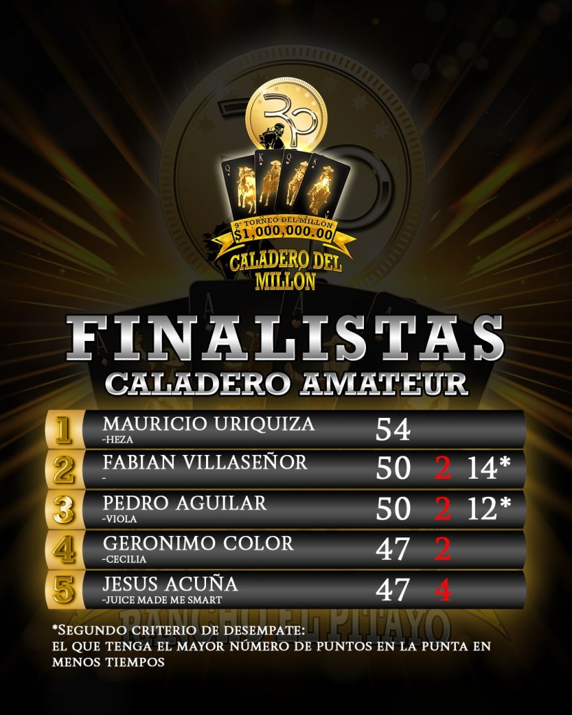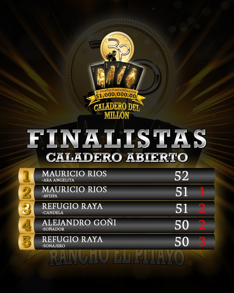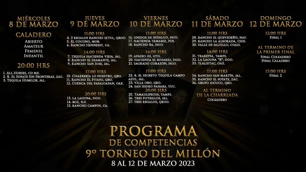 Las finales de las categorías del Caladero del Millón se realizarán el próximo domingo 12 de marzo en estas mismas instalaciones de Rancho El Pitayo de la capital queretana, al término de la primera final de equipos y junto con la final del Coleadero del Millón, cuya ronda eliminatoria se disputará por la noche del sábado, al concluir las charreadas de primera etapa.