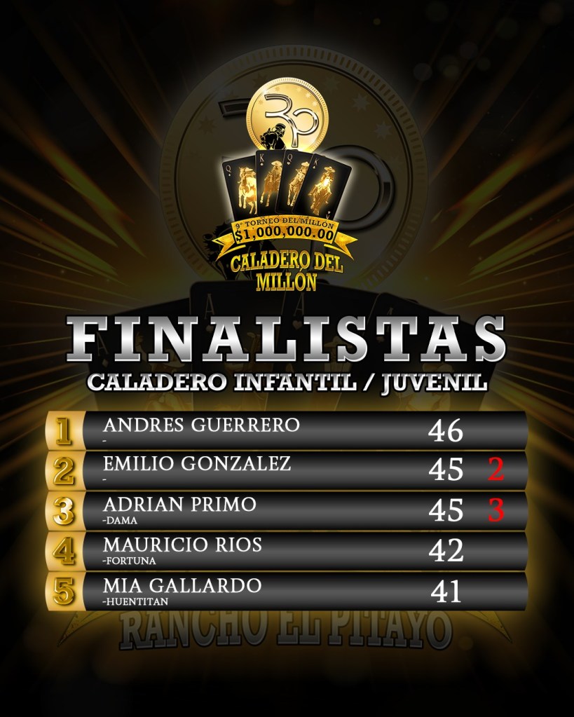 El joven Mauricio Ríos Orozco se quedó con el cuarto lugar con 42 unidades a lomos de “Fortuna”, en tanto que Mía Gallardo pegó linda sorpresa y clasificó a la instancia definitiva de este caladero infantil y juvenil al calar al ejemplar “Huentitán”, cosechando 41 puntos.