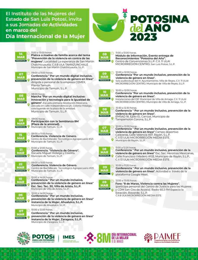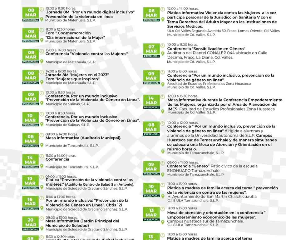 En el municipio de Villa de Arista, Zaragoza, Tamuín y Ahualulco también se efectuará la conferencia “Por un Mundo digital Inclusivo”, “Prevención de la violencia de género en línea”; a estas actividades también se sumaron la microrregión Centro y Media este. Las personas interesadas en conocer más a detalle las actividades, puede consultar las redes sociales del Instituto de las Mujeres.