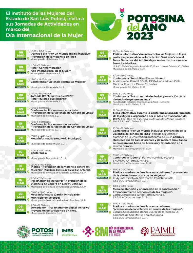 Con más de 50 actividades, el Instituto de las Mujeres del Estado (Imes) organiza una amplia jornada en el marco del Día Internacional de la Mujer a través del Programa de Apoyo a las Instancias de las Mujeres en las Entidades Federativas (PAIMEF) como lo instruyó el Gobernador de San Luis Potosí, Ricardo Gallardo Cardona, bajo el lema «Por un mundo digital inclusivo: Innovación y tecnología para la igualdad de género», sumándose a la conmemoración de ONU Mujeres y Naciones Unidas.