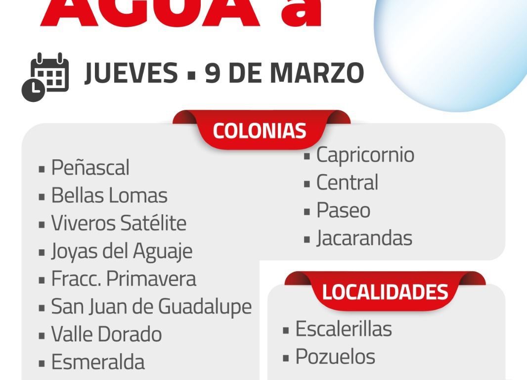 Las colonias beneficiadas este jueves con el reparto de agua, a través de la Secretaría de Bienestar, son Peñascal, Bellas Lomas, Viveros satélite, Joyas del Aguaje, fracción Primavera, San Juan de Guadalupe y las localidades rurales: Escalerillas y Pozuelos.