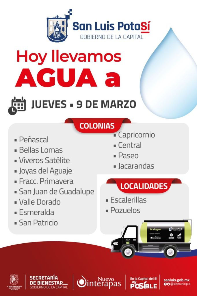 Este jueves 9 de marzo, la Secretaría de Bienestar del Gobierno de la Capital y el Nuevo Interapas reparten agua en camiones cisterna en 15 colonias y localidades del Municipio de San Luis Potosí, como parte del Plan Emergente de Distribución, para el que se redoblan los esfuerzos de abastecimiento, como instruyó el Presidente Municipal Enrique Galindo Ceballos para atender la más reciente falla de la Presa El Realito.