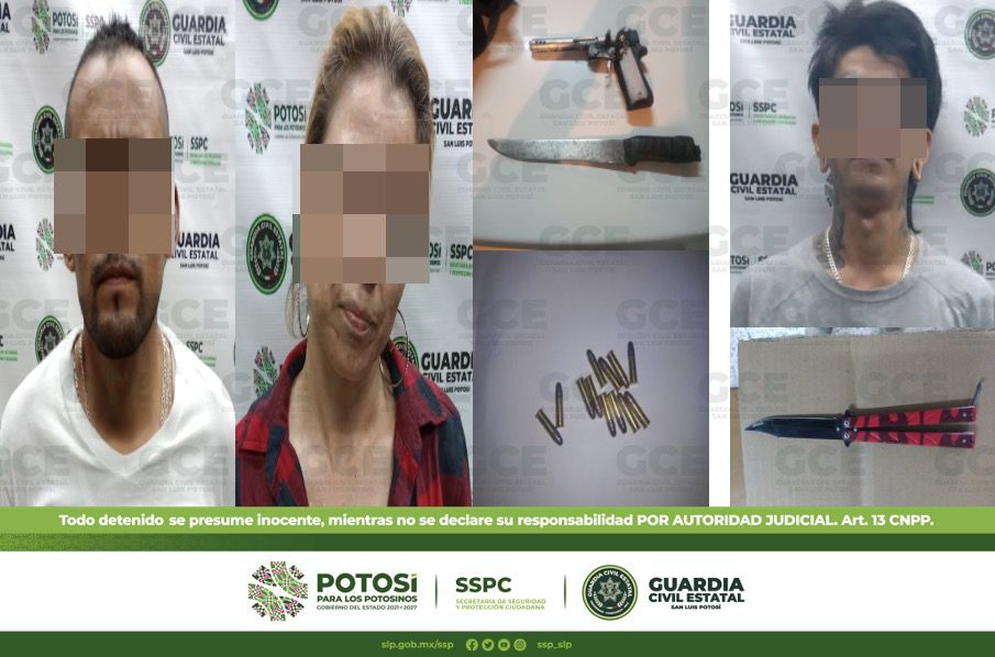 Como parte de las acciones de seguridad y vigilancia desarrolladas en zonas estratégicas de la ciudad e interior del Estado, la Guardia Civil Estatal (GCE) detuvo a dos hombres y una mujer, por el probable delito de portación de armas prohibidas.