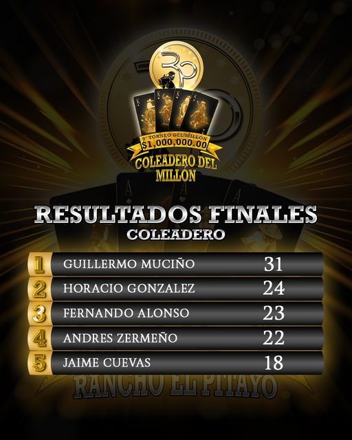 Guillermo Muciño se coronó campeón del Coleadero del Millón 2023, llevándose un jugoso premio económico, tras conquistar 31 unidades, con dos medias derechas de 11 y 12 tantos, más una media izquierda de ocho buenos.
