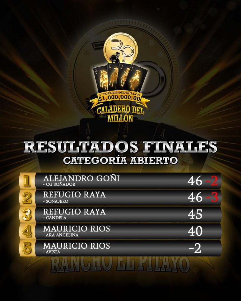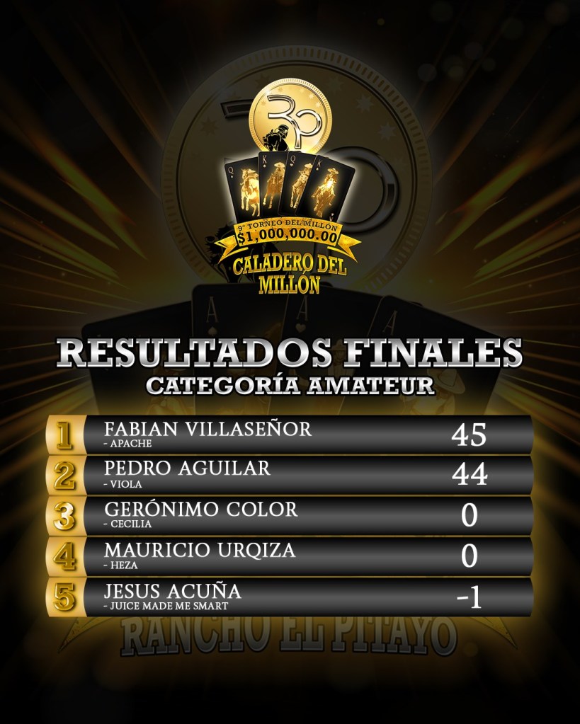 Clamoroso fue el bravío intento de José María Estrada de Rancho El Diamante, quien no logró armar el brinco antes de que terminara la primera vuelta, y a pesar de su gallarda jineteada, el paso no fue de cuenta, concluyendo en un muy destacado segundo sitio con 314 unidades.Ya con la corona asegurada, Óscar Guerra tampoco logró ejecutar su paso de la muerte, pero los dos de infracción por permanecer en el caballo manso fueron irrelevantes ya que los Tres Potrillos se alzaron campeones con 317 puntos finales, obteniendo de esta manera su cuarto título del certamen, consolidándose como el equipo más ganador del Torneo del Millón, ante la algarabía del respetable.