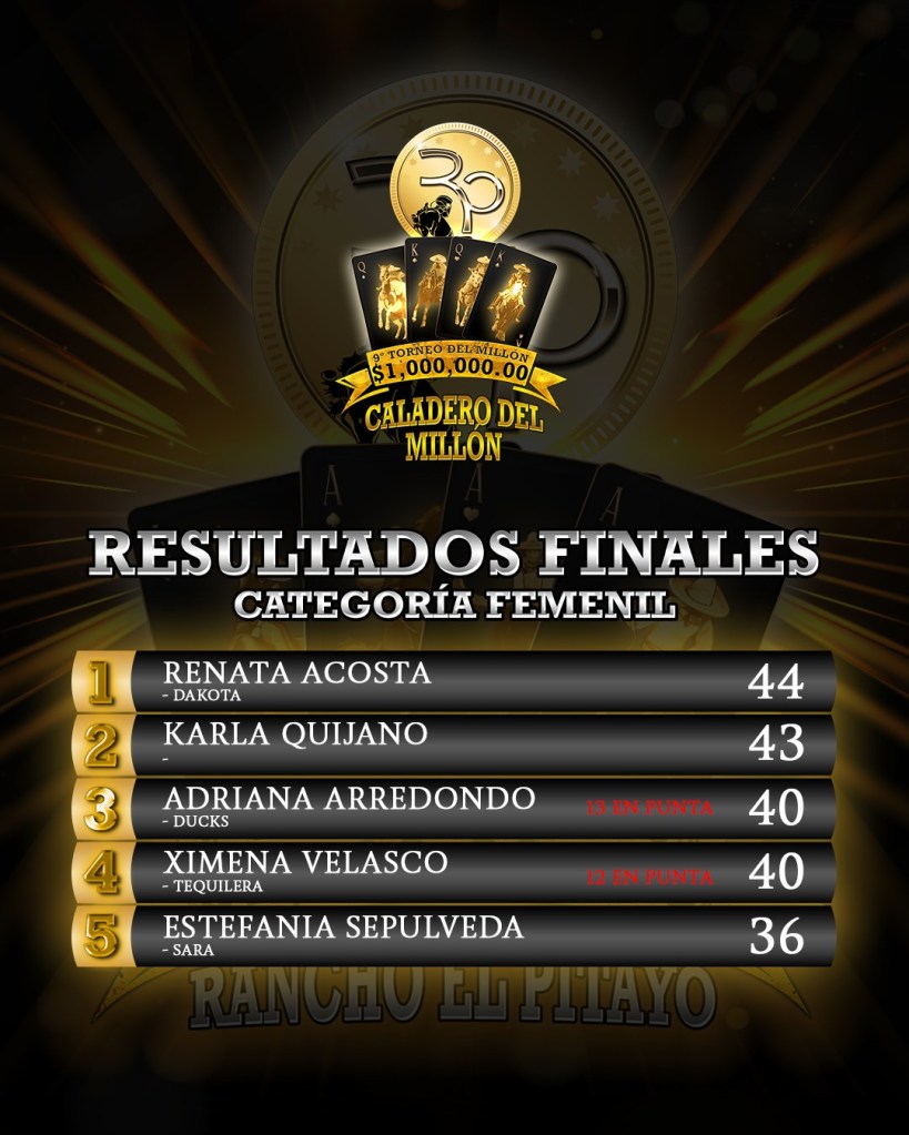 En el caso del Caladero Femenil, Renata Acosta y “Dakota” se llevaron el triunfo absoluto gracias a una cerrada victoria que obtuvieron con una magnífica labor de 44 unidades, uno más por delante de la cala que ejecutó Karla Quijano con su ejemplar, subcampeona con 43 tantos.
