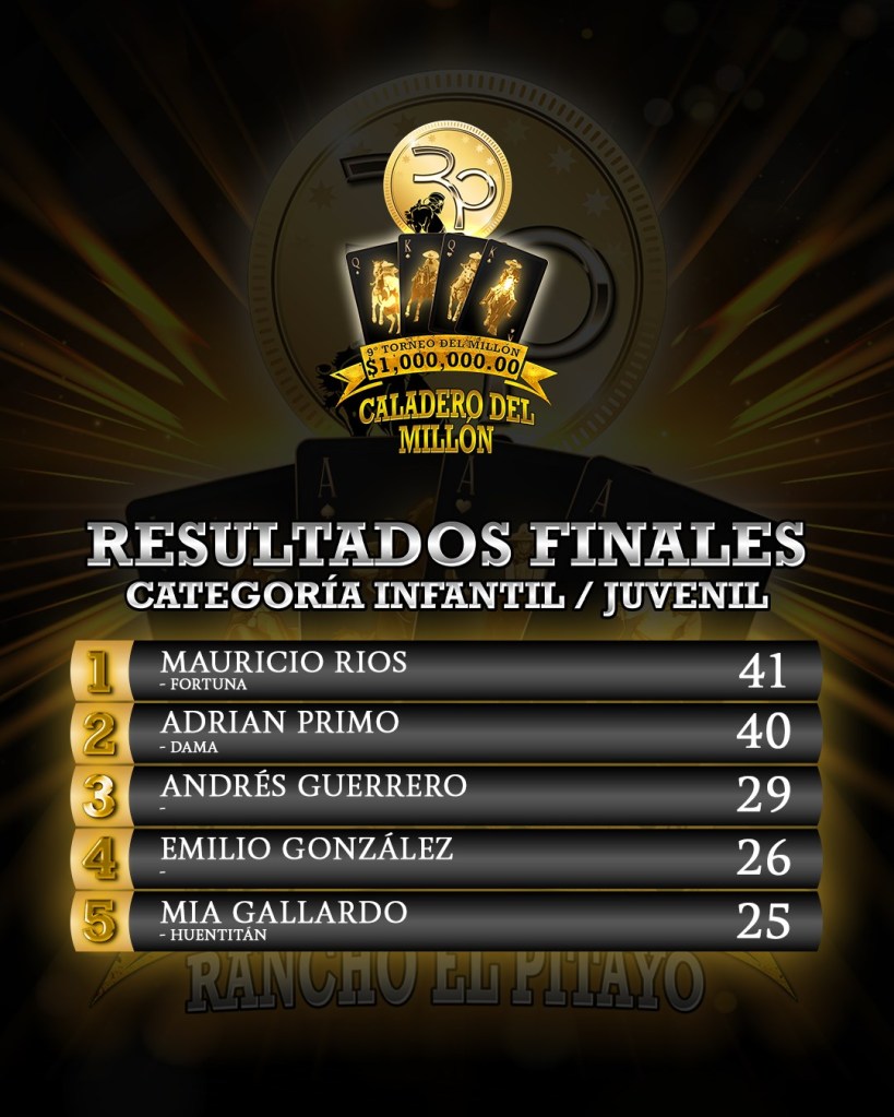 El joven Mauricio Ríos Orozco se coronó campeón del Caladero Infantil Juvenil, con una cala que recibió un total de 41 unidades montando a “Fortuna”, demostrando un gran avance en el arte de la suerte del silencio en su corta edad, y con un brillante futuro por delante.