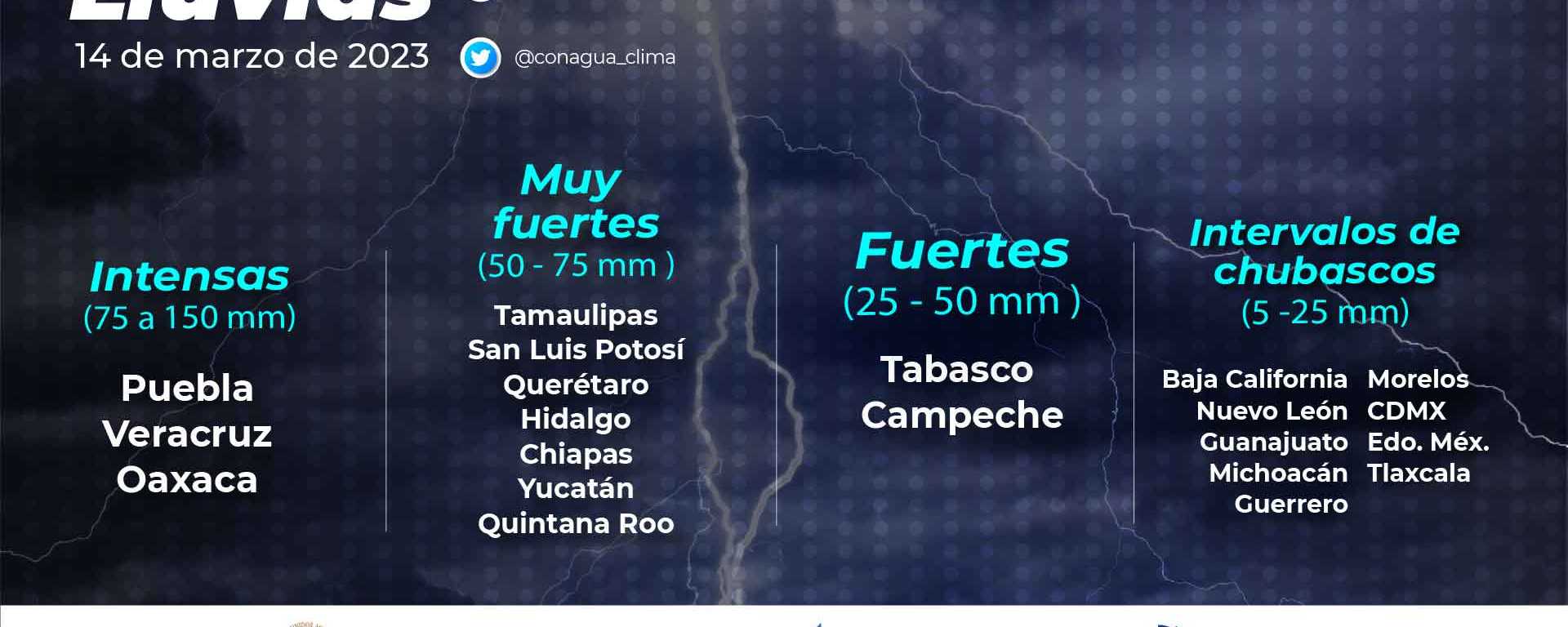 Durante la noche de hoy y la madrugada de mañana, se prevén lluvias intensas (de 75 a 150 milímetros [mm]) en regiones de Oaxaca, Puebla, San Luis Potosí, Veracruz y Yucatán; muy fuertes (de 50 a 75 mm) en Campeche, Chiapas, Hidalgo, Querétaro, Quintana Roo y Tamaulipas; fuertes (de 25 a 50 mm) en Nuevo León y Tabasco; chubascos (de 5 a 25 mm) en la Ciudad de México, Estado de México, Guanajuato, Guerrero, Michoacán, Morelos y Tlaxcala, así como lluvias aisladas (de 0.1 a 5 mm) en Coahuila, Colima, Jalisco y Zacatecas.