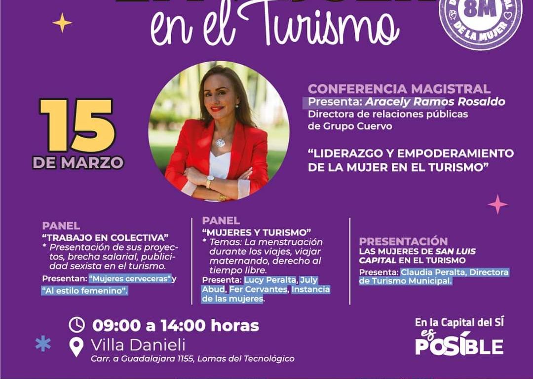 En el evento se desarrollarán los paneles Trabajo en colectiva: presentación de proyectos, brecha salarial, publicidad sexista en turismo, a cargo de Mujeres Cerveceras y Al Estilo Femenino; Mujeres y Turismo: La menstruación durante los viajes, viajar maternando, derecho al tiempo libre, con la participación de Lucy Peralta, July Abud, Fer Cervantes y la Instancia de las mujeres. Finaliza con la presentación del Estudio de Caracterización de las Mujeres en el Turismo, caso San Luis Potosí a cargo de la Directora de Turismo Municipal, Claudia Peralta Antiga.
