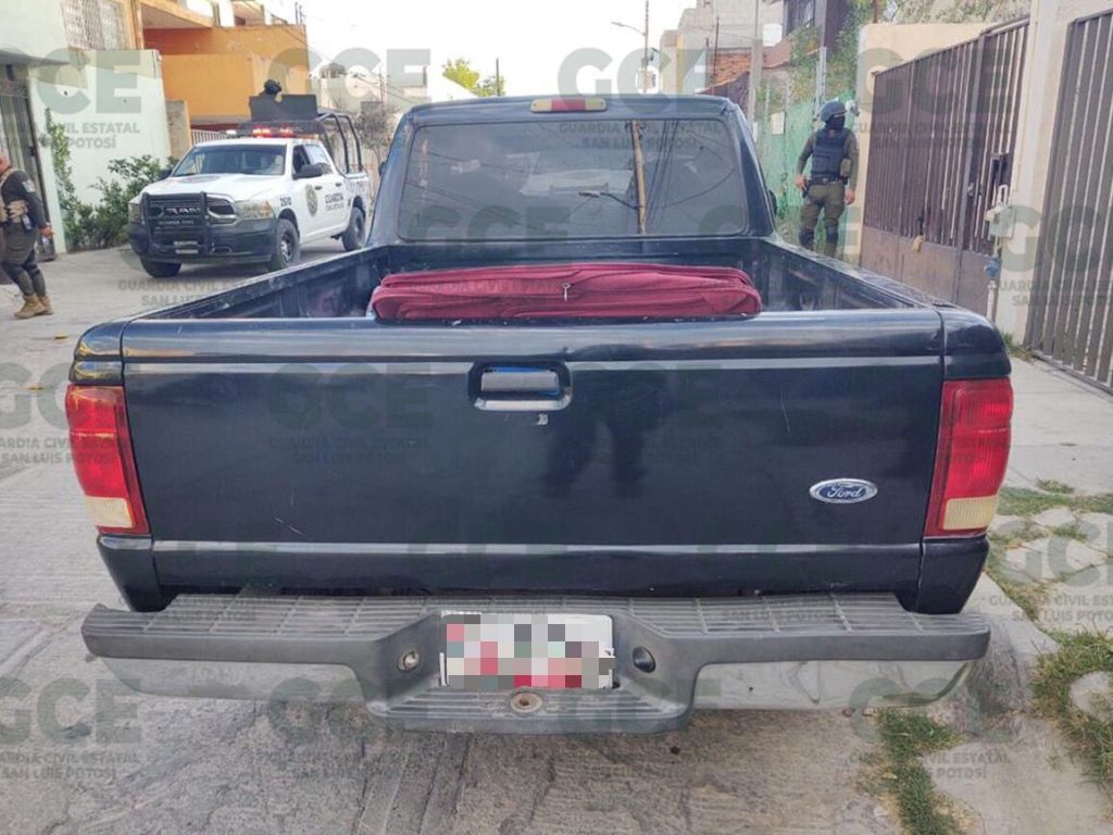 Ante la presencia de movimientos inusuales en un inmueble y de civiles armados en el exterior se decidió intervenir, pues además se reportaba que estaban en una camioneta en color negro; al arribo de los agentes, varios hombres huyeron en distintas direcciones dejando la unidad abierta y abandonada y con varias maletas en la caja de la misma.