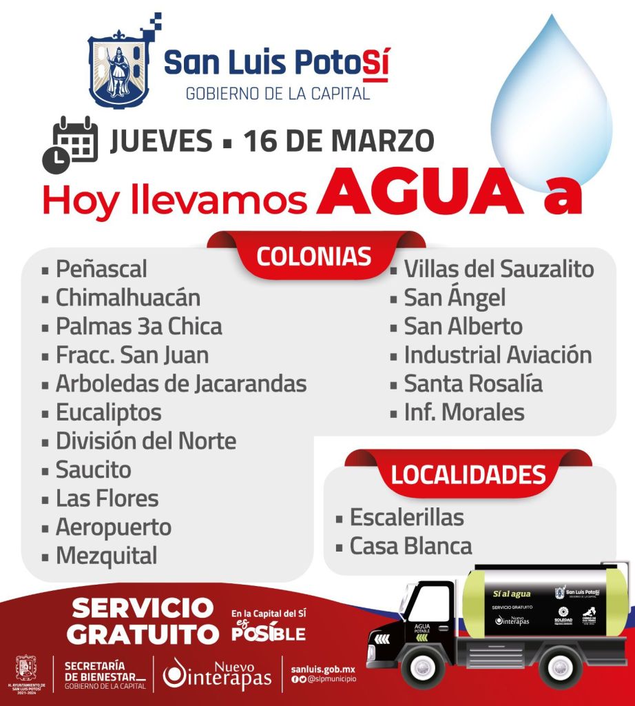 Como parte del Plan Emergente para Abastecer Agua en las zonas que necesitan, el Gobierno de la Capital del Sí mantiene su programación para garantizar su abasto a toda la población potosina. Por ello, de manera conjunta, la Secretaría de Bienestar del Municipio y el Interapas, atienden las solicitudes de más de 15 colonias mediante camiones cisterna.
