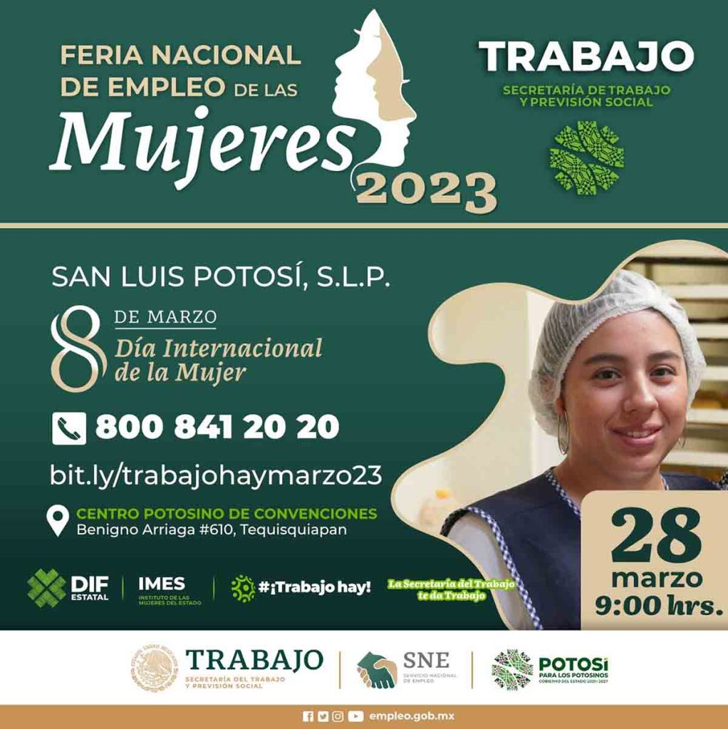 A fin de continuar con la estrategia de facilitar a las y los potosinos el acceso a oportunidades laborales, emprendida por el Gobierno del cambio que encabeza, Ricardo Gallardo Cardona, la Secretaría del Trabajo y Previsión Social (STPS), en coordinación con el Sistema Estatal DIF y el Instituto de las Mujeres del Estado (Imes), llevarán a cabo en la ciudad capital, la Feria Nacional de Empleo de las Mujeres 2023 el próximo 28 de marzo.