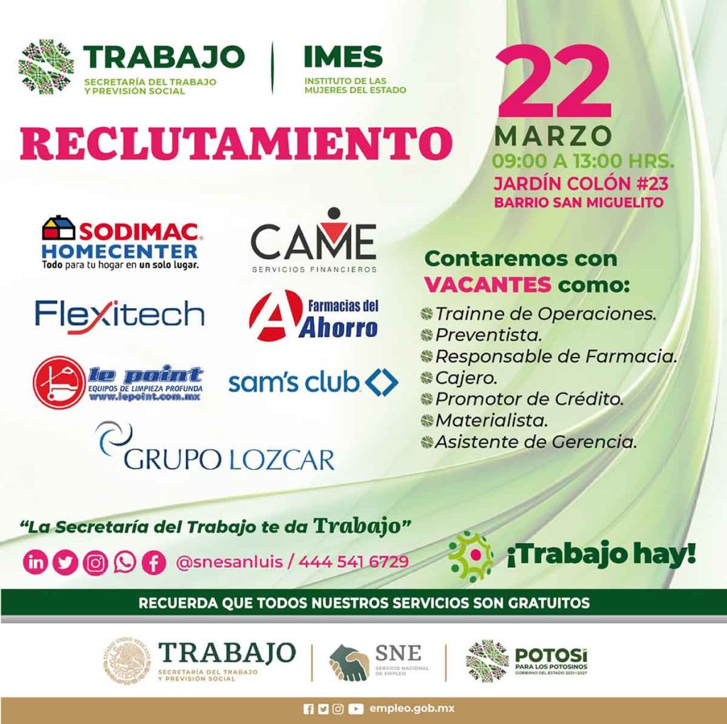 Como parte de las acciones del programa “La Secretaría del Trabajo te da trabajo” impulsado por el Gobernador de San Luis Potosí, Ricardo Gallardo Cardona, el Instituto de las Mujeres (Imes) será sede de la tercera “Jornada de Reclutamiento”, que busca propiciar en un espacio, la igualdad laboral, fuentes de trabajo con perspectiva de género y fomentar el empoderamiento económico de las potosinas.