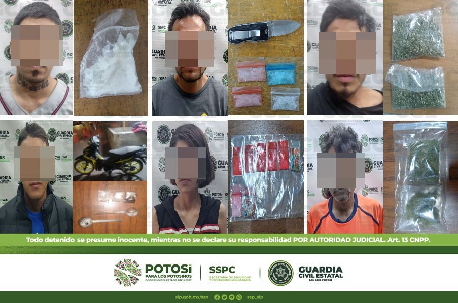 En la colonia Prados Segunda Sección, resultó detenido José de 42 años de edad con dos dosis de marihuana; a su vez, en la colonia Lomas Cuarta Sección, Julio de 25 años fue detenido con una dosis de marihuana; en la misma zona, Daniel de 30 años quedó detenido con una dosis de marihuana; resultado de los patrullajes sobre la colonia Saucito, fueron detenidos Juan de 23 años y Sunem de 30 años, con 10 dosis de “cristal” y un arma prohibida.