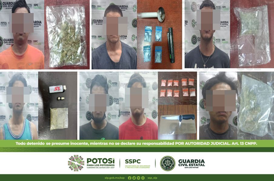 A su vez, en el municipio de Soledad de Graciano Sánchez, resultaron detenidas cuatro personas: una de ellas en la colonia San Francisco de Asís, tratándose de Rubén de 28 años de edad, a quien se le aseguraron cuatro dosis de “cristal”; en la colonia Fresnos, fue detenido Sebastián de 23 años con una dosis de marihuana.