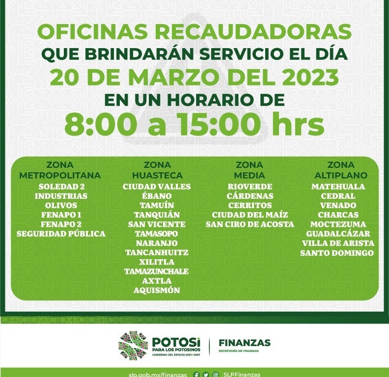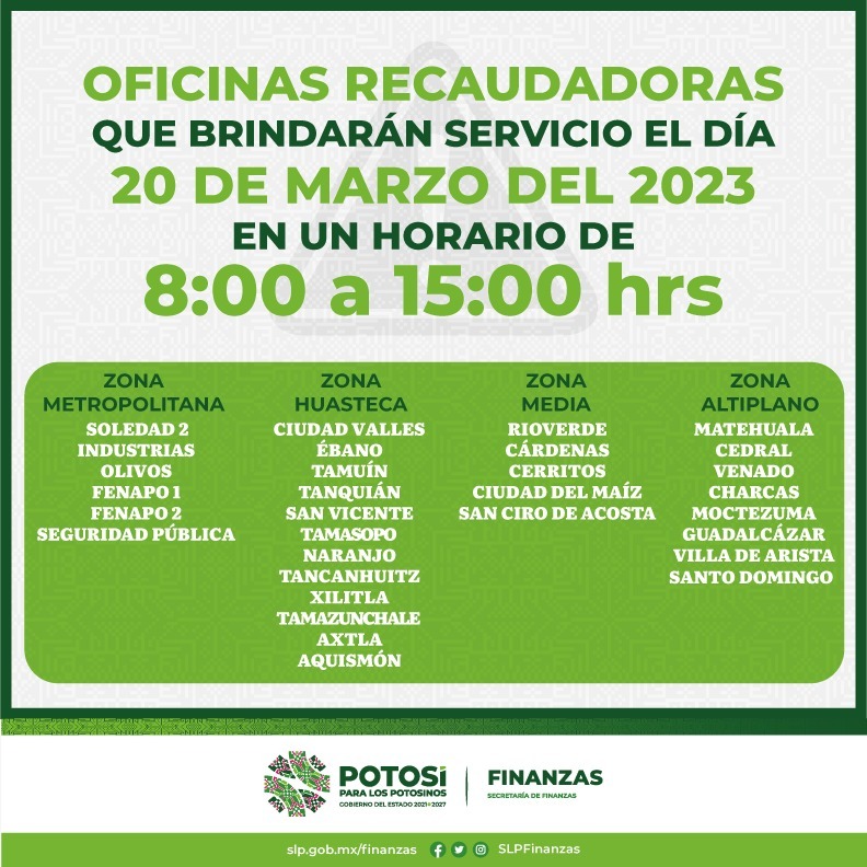 Con la intención brindar un servicio permanente y de calidad, como lo ha instruido el Gobernador de San Luis Potosí, Ricardo Gallardo Cardona, la Secretaría de Finanzas (Sefin) anunció que, en una muestra más del compromiso y atención ciudadana, 31 oficinas recaudadoras de todo el Estado estarán funcionando el próximo lunes 20 de marzo en un horario de 8:00 a 15:00 horas.