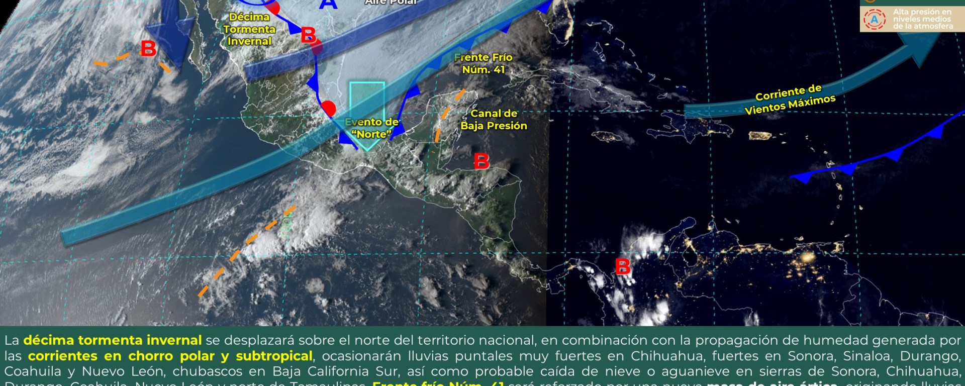 Posible caída de nieve o aguanieve: principalmente en sierras de Sonora, Chihuahua, Durango, Coahuila, Nuevo León y norte de Tamaulipas.