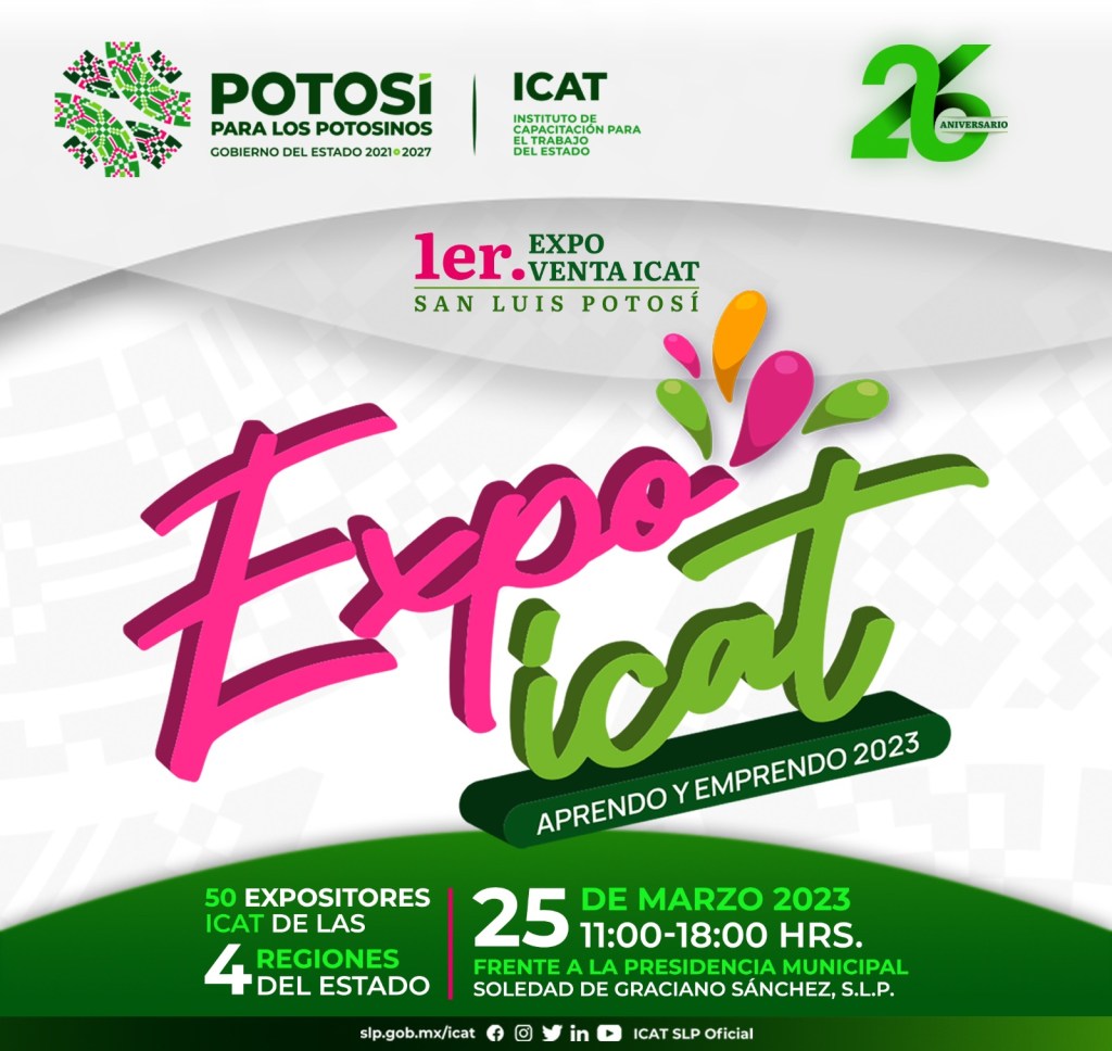 Con la participación de más de 50 emprendedoras y emprendedores, atendiendo la instrucción del Gobernador de San Luis Potosí, Ricardo Gallardo Cardona, este 25 de marzo 2023 en la plaza principal del municipio de Soledad de Graciano Sánchez, el Instituto de Capacitación para el Trabajo del Estado (Icat) llevará a cabo la “Expo Venta”, donde se pondrán a la venta productos elaborados dentro de las especialidades que ofrece el instituto, como manualidades, artesanías, gastronomía, repostería, artículos de belleza y aseo personal, entre otros.