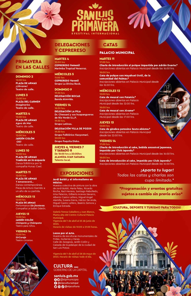 Daniel García Álvarez de La Llera, Director de Cultura Municipal, indicó que todas las actividades del II Festival Internacional San Luis en Primavera son completamente gratis, mismas que se desarrollarán del 1 al 15 de abril de 2023, en 13 sedes y calles del Centro Histórico de San Luis Potosí, eventos completamente gratuitos y para todos los públicos.