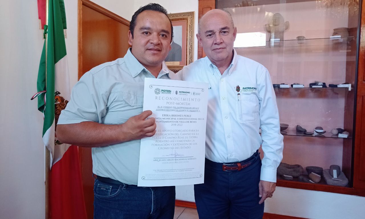 E incluso como primera acción del Consejo Municipal del Patrimonio de Áreas y Centros Históricos de Villa de Reyes, Juan Carlos Machinena entregó al alcalde, un reconocimiento Post Mortem en honor a la ex presidenta municipal, Erika Briones Pérez, por todo lo que hizo para impulsar en la creación de este Consejo Municipal y facilitarles llevar a cabo las investigaciones del “Camino de Tierra Adentro» y contribuir en apoyar a los cronistas municipales.