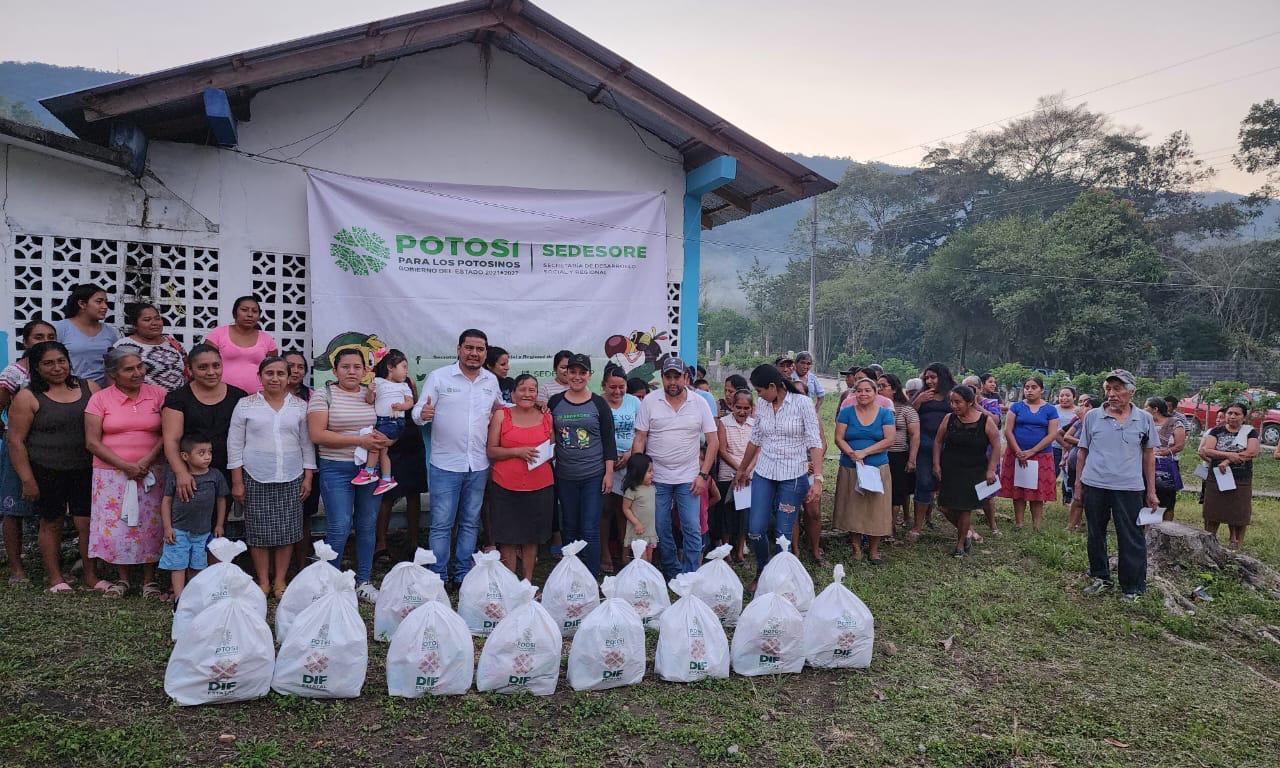 Agregó que esta semana, Sedesore entrega más de cien mil apoyos en municipios del Altiplano como Real de Catorce, Venado y Salinas de Hidalgo; de la región Centro, en Soledad de Graciano Sánchez, Armadillo de los Infante y Villa de Reyes; en la región Media en Santa Catarina, San Ciro de Acosta y Cerritos, mientras que, en la Huasteca en Ébano, Tancanhuitz, Tampamolón Corona, Axtla de Terrazas, Aquismón, Tanlajás y Tamazunchale.