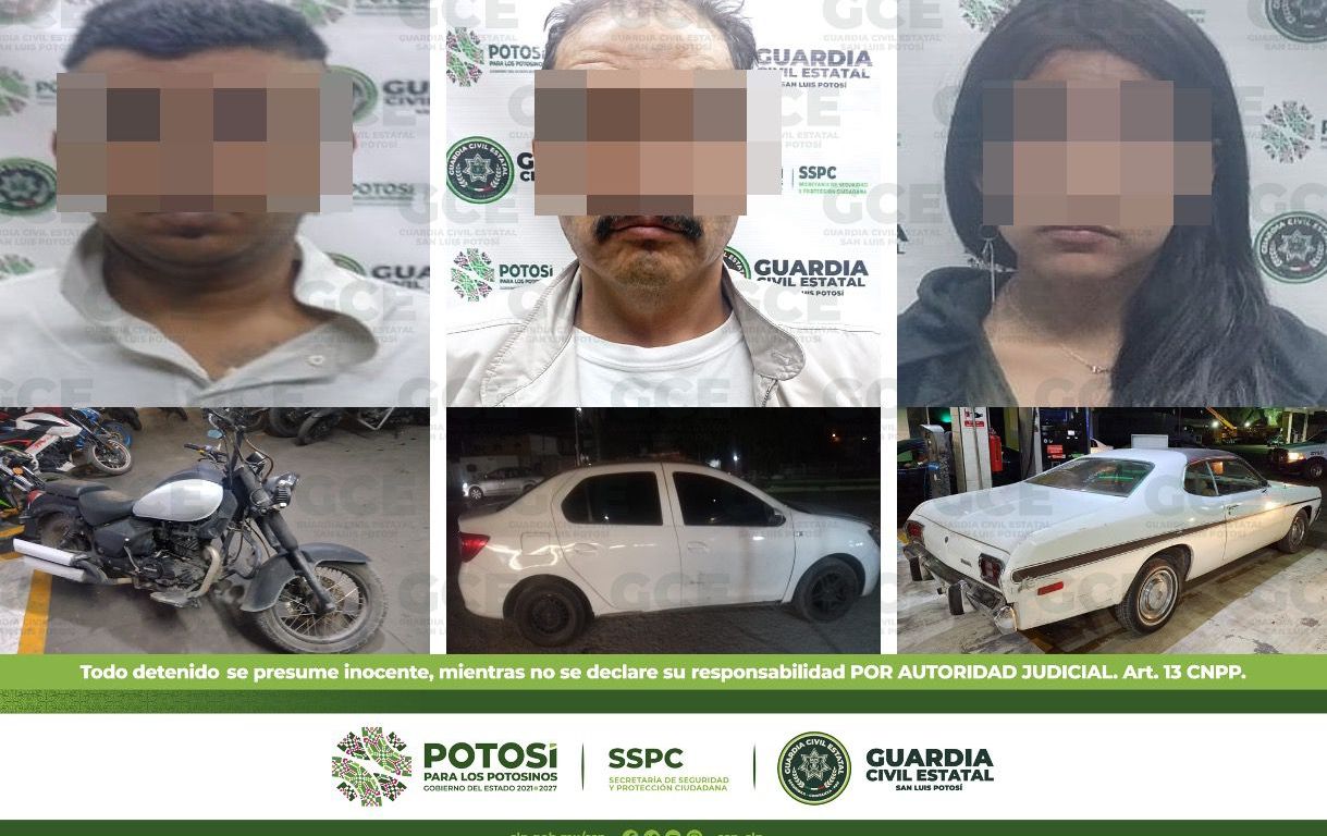 Agentes de la Guardia Civil Estatal (GCE) detuvieron a dos hombres y una mujer, por el presunto delito de tripular unidades motoras con reporte de robo, dentro de los dispositivos de vigilancia y seguridad desarrolladas de manera permanente en la zona metropolitana.