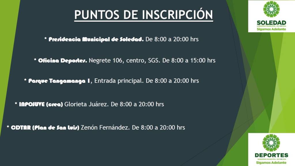 El funcionario municipal recordó que existen varios puntos que fueron habilitados para realizar el proceso de inscripción, entre estos, destacan la Oficina de la Dirección de Deportes, situada en Negrete No. 106; Presidencia Municipal; CEDETAR, situada en el Estadio Plan de San Luis; Parque Tangamanga 1, en la entrada principal; INPOJUVE (Crea), Glorieta Juárez.