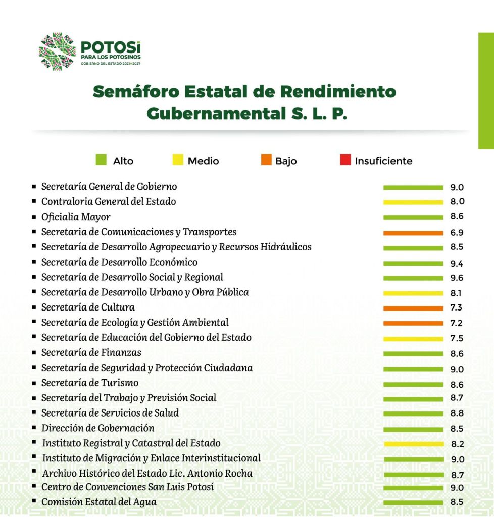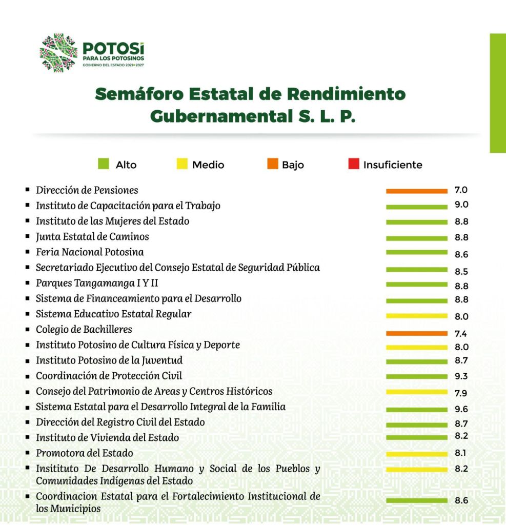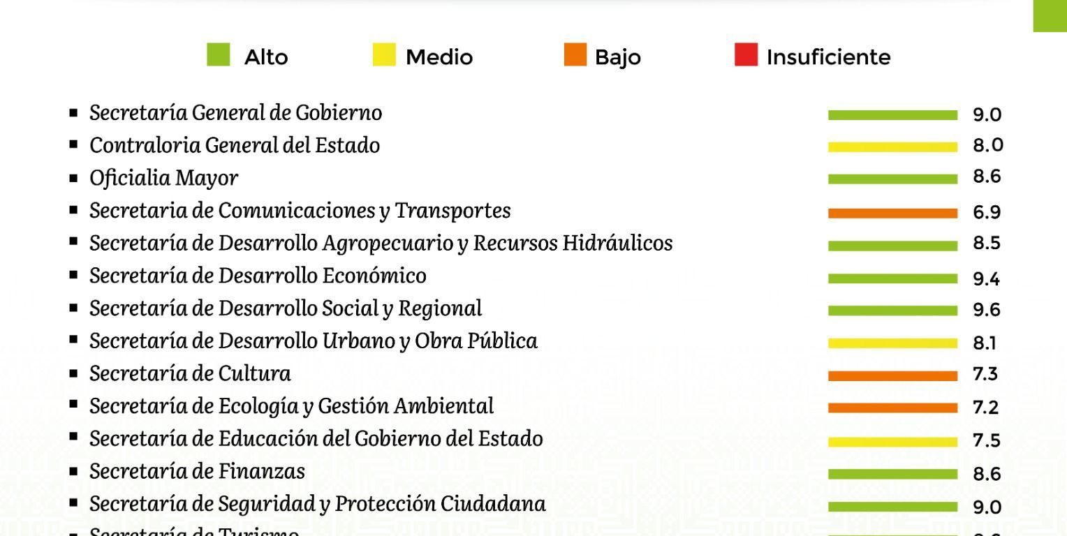 El Semáforo de Rendimiento Gubernamental, tiene cuatro valoraciones, Alto, Medio, Bajo e Insuficiente, cuyos colores verde, amarillo, naranja y rojo, indican el nivel de cumplimiento en los parámetros; a un costado del color de cada dependencia evaluada, se ubica una referencia numérica que indica la calificación de cada área de la administración estatal.
