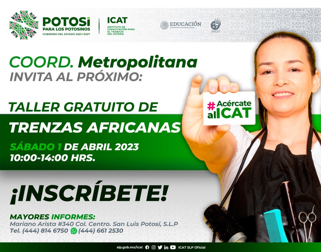En seguimiento al esfuerzo del Gobernador de San Luis Potosí, Ricardo Gallardo Cardona, de promover el emprendedurismo a favor de las y los potosinos de las cuatro regiones del Estado, el Instituto de Capacitación para el Trabajo (Icat), impulsa talleres gratuitos para dar a las y los emprendedores, conocimientos y habilidades para crear, desarrollar y poner en marcha una idea de negocio, como el de “Automaquillaje y Trenzas Africanas”, que se llevará a cabo este primero de abril.