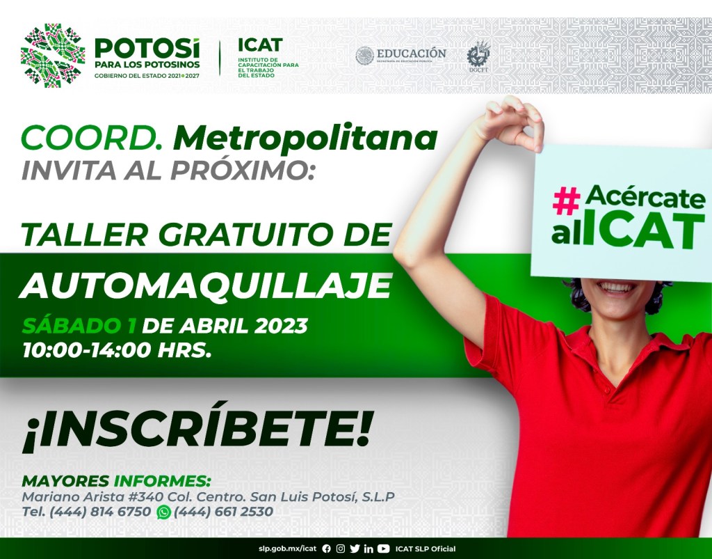 Los talleres son gratuitos y tendrá lugar en la coordinación metropolitana del Icat, que se encuentra en Mariano Arista #340, zona centro de la capital potosina, serán el sábado primero de abril de 10:00 a 14:00 horas. Las y los interesados pueden solicitar informes a través de los teléfonos 444-814-6750, vía WhatsApp, 444-661-2530, o por medio de las redes sociales Icat SLP – Oficial.