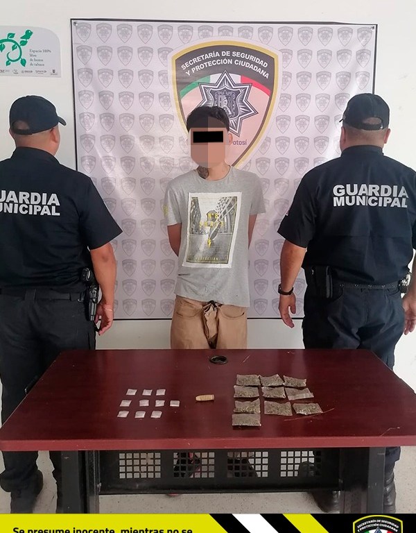 Derivado de los patrullajes de prevención y seguridad sobre el cuadrante norte de la ciudad, agentes de Guardia Municipal de la Secretaría de Seguridad y Protección Ciudadana (SSPC) efectuaron la detención de un joven de 21 años que fue sorprendido inhalando sustancias tóxicas en vía pública. Al momento de su revisión preventiva de seguridad se encontró en posesión de veinte bolsas de polietileno que contenía las drogas conocida como cristal y marihuana, los hechos se suscitaron en la colonia Valle Escondido.