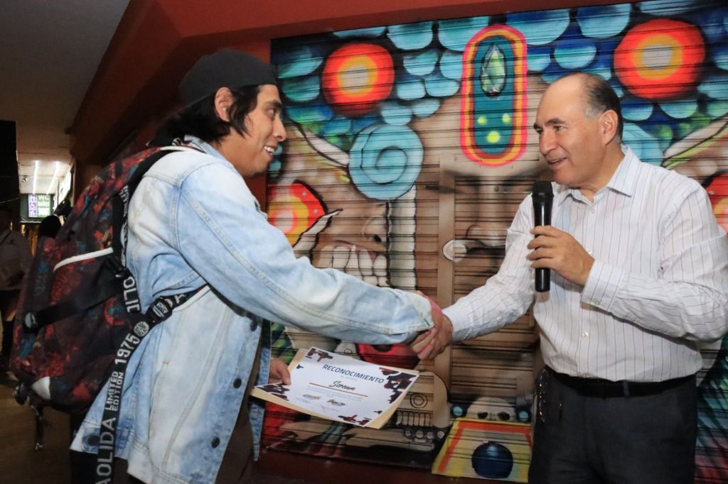 Luego del recorrido, el Alcalde se reunió en Palacio Municipal con los 41 muralistas, entre ellos Rico Rey, Alejandro Alonso “Extreme”; Joana Ponce “Jo”, “Tres D”; así como jóvenes estudiantes de arquitectura y diseño que se sumaron al proyecto, a quienes se entregó diplomas y estímulos económicos como reconocimiento del arte que entregan a la ciudad.