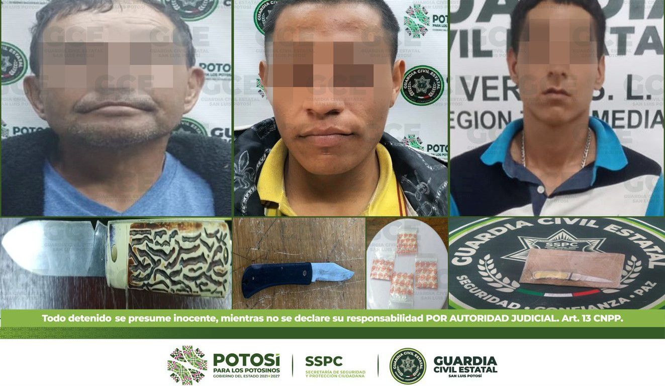 Otro de los sucesos fue en las calles 94 y 50 de la colonia Prados Segunda Sección, ahí fue detenido Felipe de 64 años con una navaja de 19 centímetros; por último, en el Ejido Puente del Carmen, del municipio de Rioverde, fue detenido Rodrigo de 25 años con una navaja de 15 centímetros.