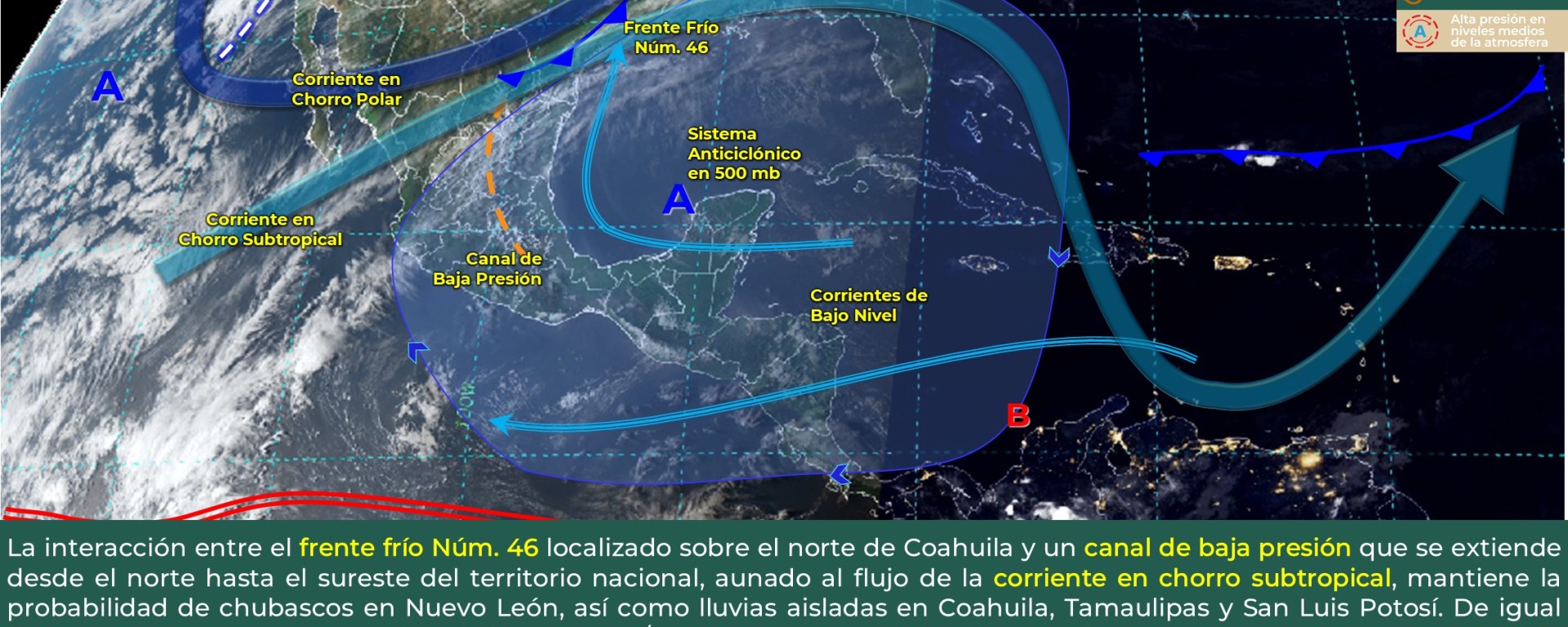 Intervalos de chubascos (5 a 25 mm): Coahuila, Nuevo León, Tamaulipas, San Luis Potosí, Guanajuato, Querétaro, Hidalgo, Estado de México, Puebla, Veracruz, Oaxaca y Chiapas.