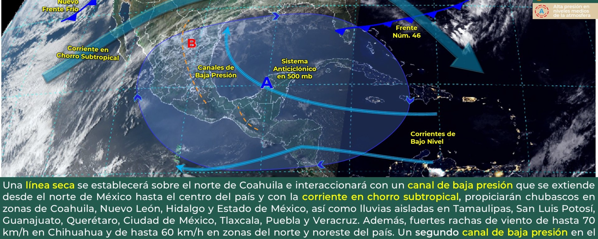 Viento con rachas de 60 a 80 km/h: Golfo de California, y con tolvaneras: Baja California Sur, Coahuila, Nuevo León, Tamaulipas, San Luis Potosí, Zacatecas y Durango.