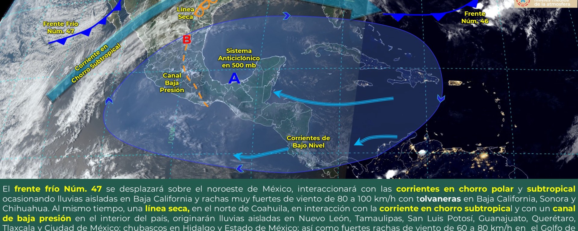 Viento con rachas de 60 a 80 km/h: Golfo de California, y con tolvaneras: Baja California, Baja California Sur, Sonora, Durango, Zacatecas, San Luis Potosí, Coahuila, Nuevo León, Campeche y Yucatán.