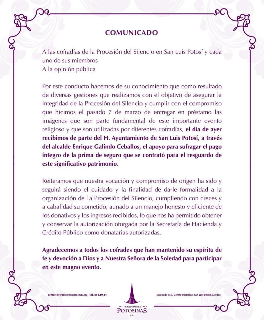 El Gobierno de la Capital, que encabeza el Alcalde Enrique Galindo Ceballos, solidario con la asociación civil Tradiciones Potosinas, tomó la decisión de cubrir la prima de seguro que protege las imágenes religiosas de cualquier eventualidad durante el desarrollo de la Procesión del Silencio 2023.