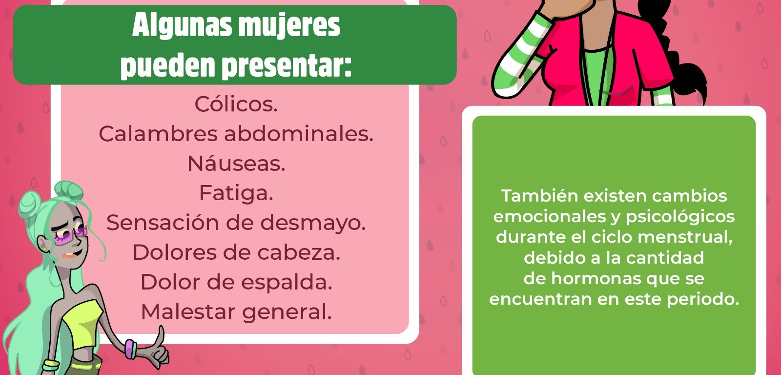 Finalmente, recomendó a las jóvenes acudir a los “Servicios Amigables” ubicados dentro de los centros de Salud, cuando su periodo dure más de ocho días, si el ciclo viene con más de 90 o menos de 21 días de diferencia, si tienen 15 años o más y nunca han tenido un periodo menstrual, si han pasado 3 años o más desde que tus senos aumentaron de tamaño y no has tenido ningún periodo, si los periodos son irregulares, si el dolor menstrual interfiere con la realización de actividades cotidianas o tienen alguna inquietud sobre tu periodo.